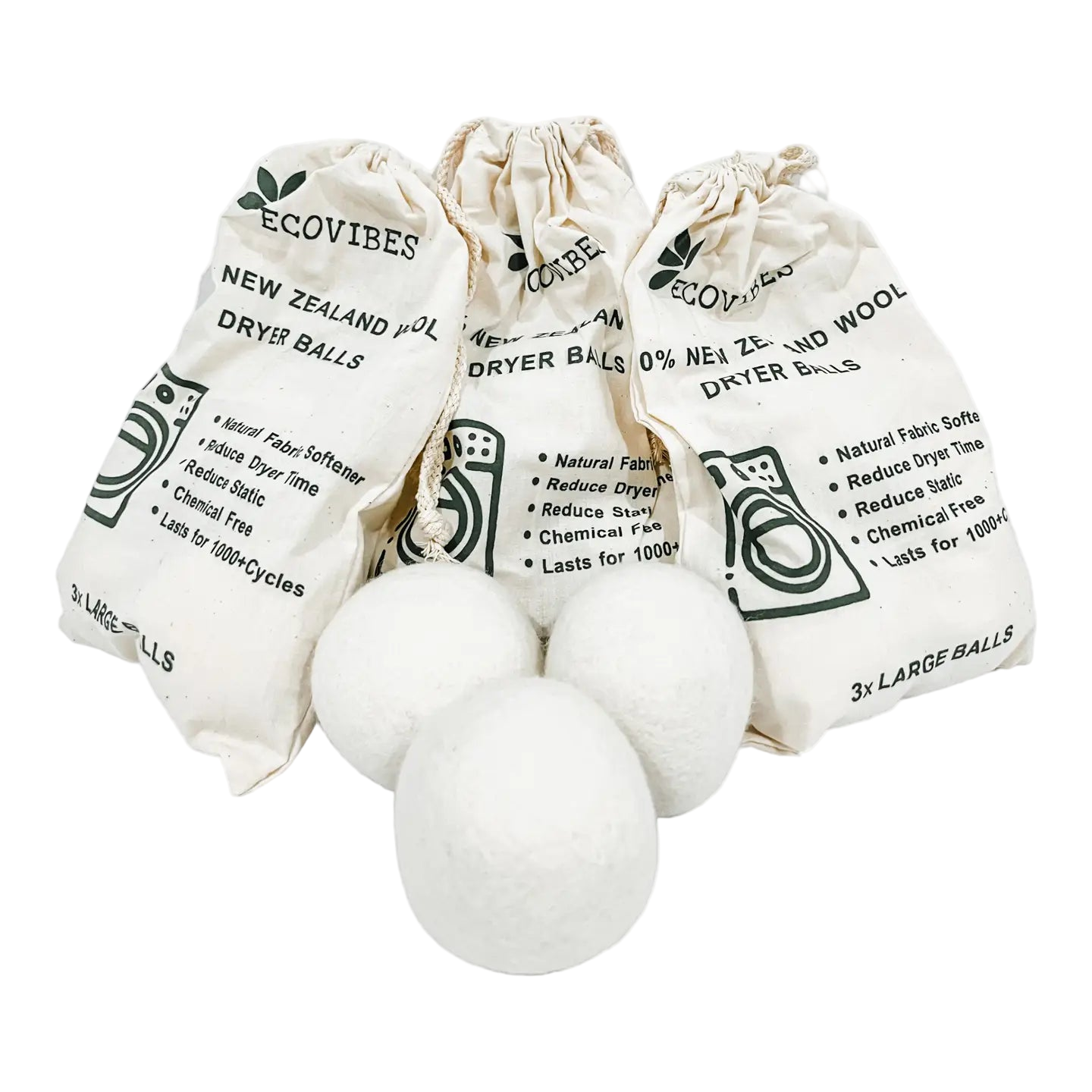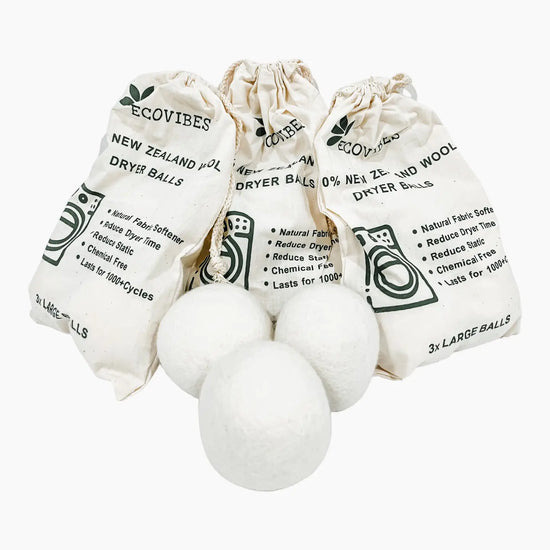 Ecovibes 100% New Zealand Wool Dryer Balls power through loads of laundry, reducing drying time and energy while still being a safe, hypoallergenic alternative to fabric softeners and dryer sheets. Generationally farmed and crafted with no chemicals, synthetics, or fillers, each premium ball is designed to optimize airflow, absorbing moisture to cut out drying time! Reusable for over 1000 loads of laundry plus the ability to add essential oils for a subtle, lasting scent, this set of three extra-large dryer balls comes in a stylish cotton bag.